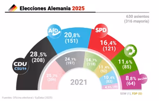 La Unión Democristiana (CDU/CSU), liderada por Friedrich Merz, encabeza el resultado en las proyecciones con un 28,5 % de los votos. La ultraderechista AfD alcanza un 20,5 %, marcando su mejor desempeño electoral hasta la fecha.