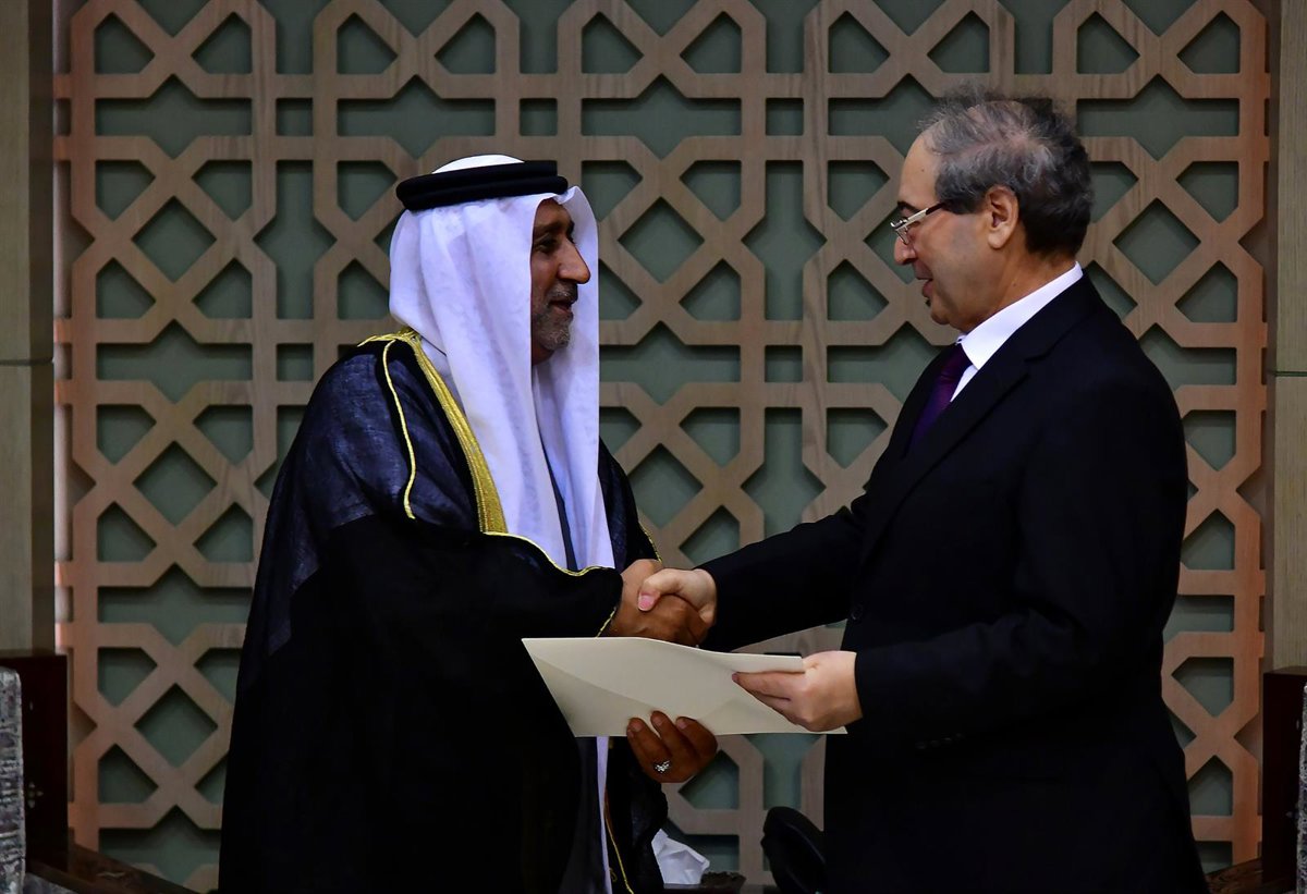 El nuevo embajador de Emiratos Árabes Unidos (EAU) en Siria, Hasán Ahmad al Shahi (i), presenta sus credenciales al ministro de Exteriores sirio, Faisal Mikdad (d) - Europa Press/Contacto/Ammar Safarjalani