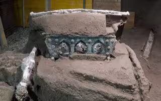"El carro ha sido hallado en un pórtico de doble nivel que se abre a un patio descubierto, y que presenta el techo de madera carbonizada con su red de vigas , conservadas en su totalidad", añade el equipo en un comunicado publicado en su página web.