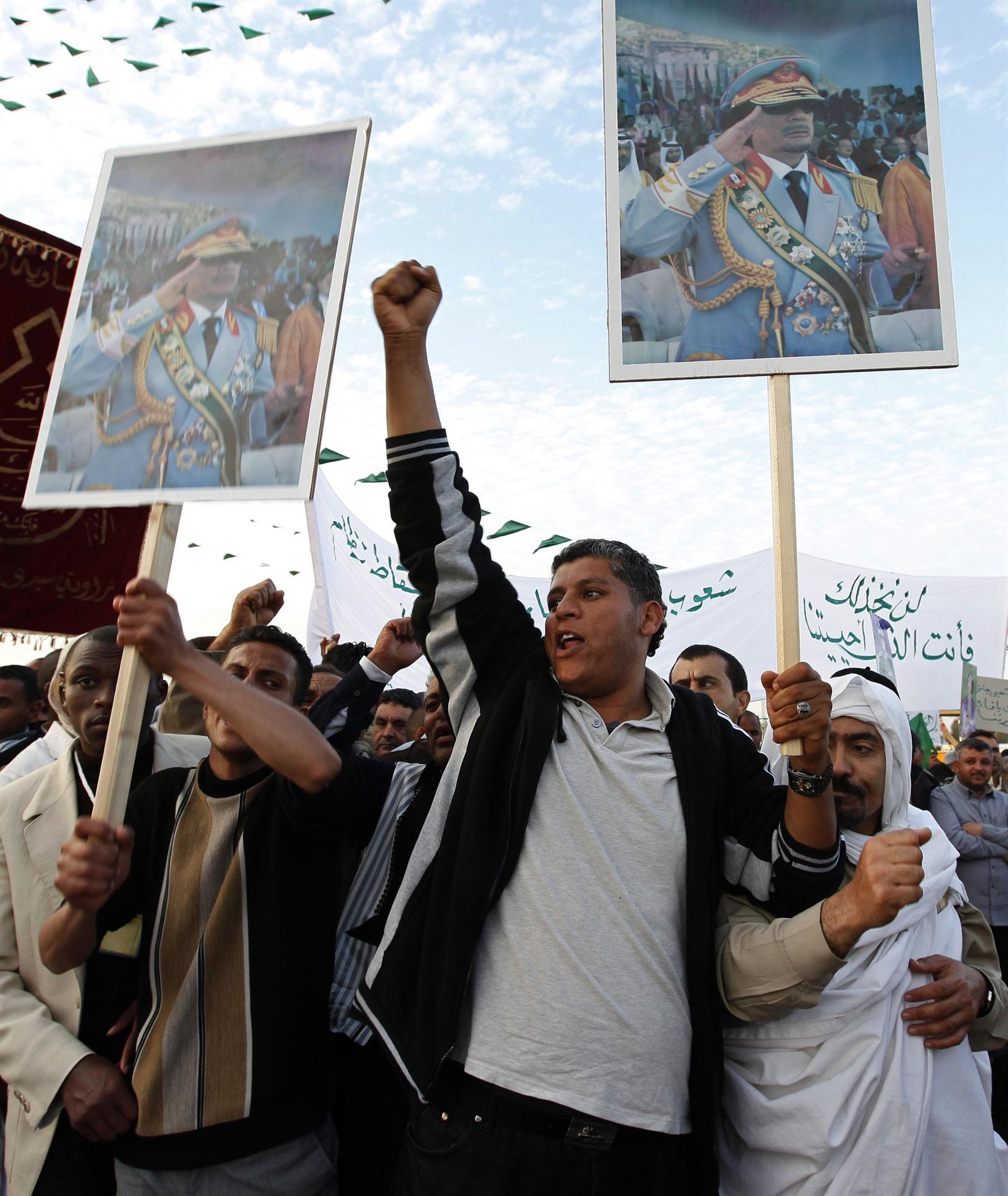 La agencia oficial JANA ha informado de actos a favor de Gadafi en otras ciudades, incluida Benghazi. Los asistentes portaban retratos del dirigente y coreaban consignas como "sacrificaremos nuestra sangre y almas por ti, nuestro líder" y "somos una generación construida por Muamar y cualquiera que se oponga será destruido".