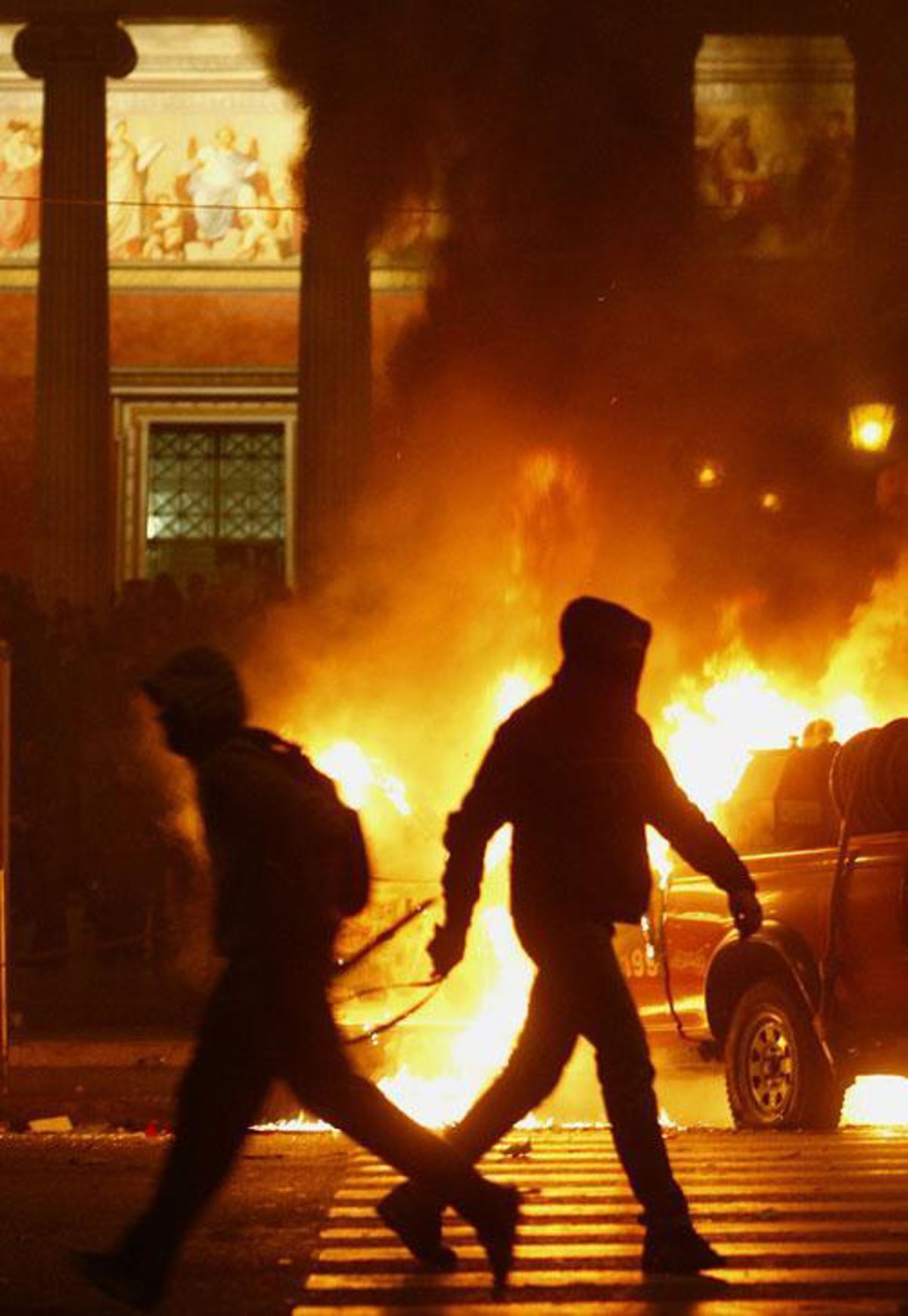 Al caer la noche en la capital griega, miles de personas marcharon codo con codo a lo largo de las principales calles de la ciudad. Elementos anarquistas reventaron las lunas de los coches y corearon 'Polis, Cerdos, Asesinos'. Algunos lanzaron artefactos incendiarios contra los policías y, por tercera noche, ardieron comercios y se escucharon explosiones.