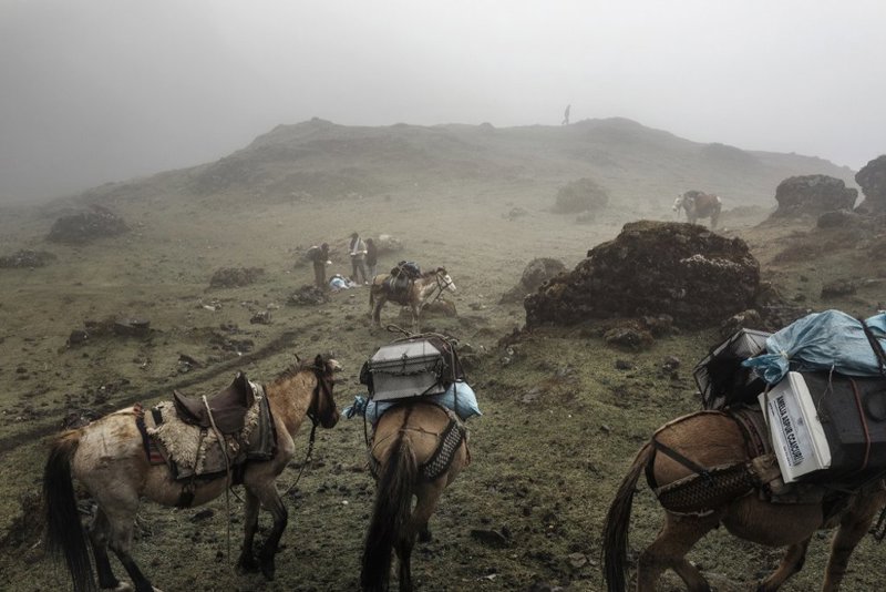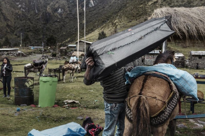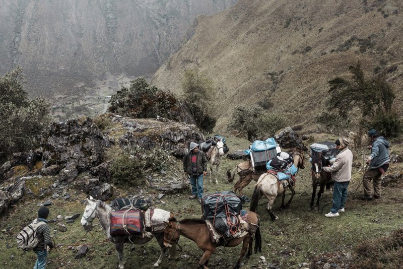 "Las sendas en la montaña son muy escarpadas y la carga que portan los caballos hay que reajustarla constantemente", aclara Cook-Pellegrin, lo que explica que el viaje hasta Totora dure cuatro horas, cuando por regla general los locales suelen recorrerlo en una hora a pie. La lluvia y la niebla que se encuentran en el camino tampoco facilitan el recorrido.
