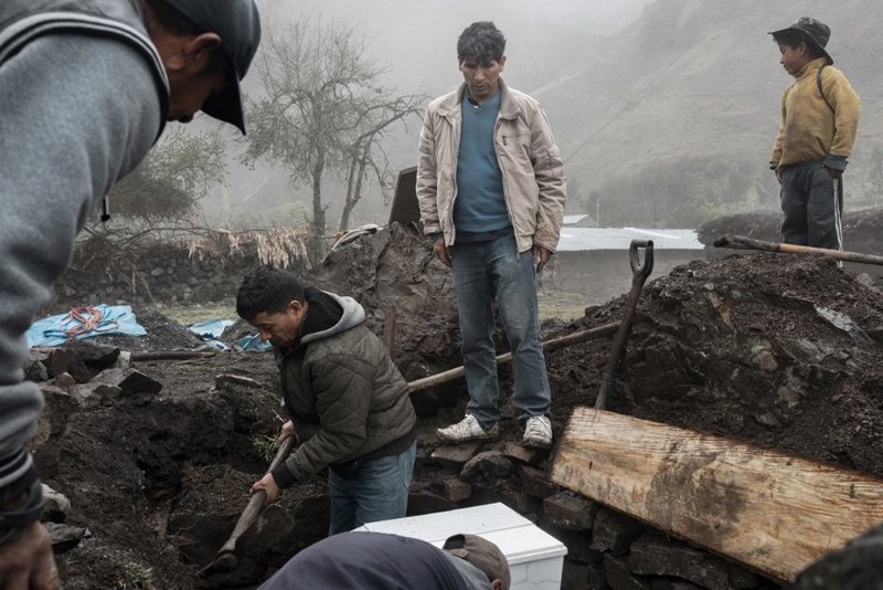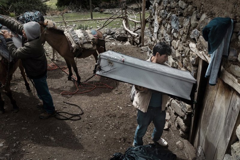 El traslado de los restos mortales de los cuatro miembros de la familia Aspur hasta Totora es largo. Tras siete horas por carretera y pasar la noche en una pequeña localidad, hacen falta otras dos horas en coche para llegar a los pies de la montaña, donde los féretros son cargados en caballos, explica la fotógrafa.