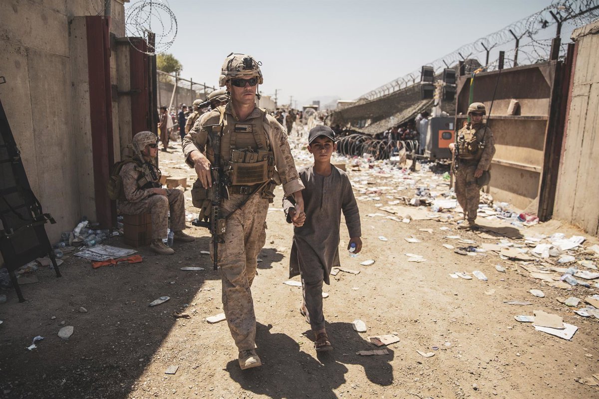 Un marine de Estados Unidos junto a un niño en el aeropuerto de Kabul - Ssgt. Victor Mancilla/U.S. Marin / DPA