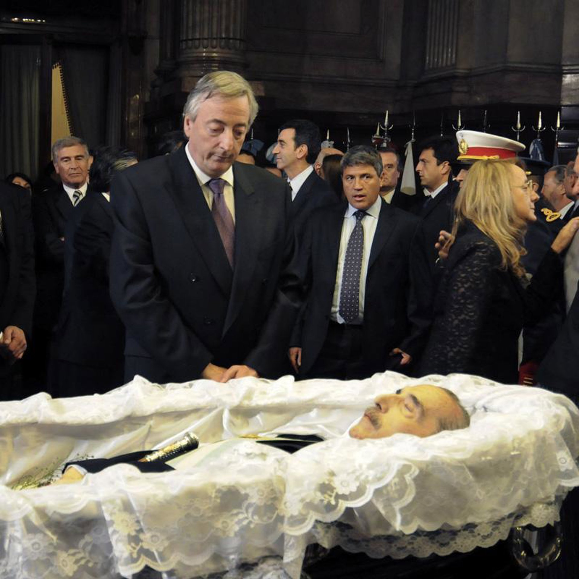 El ex presidente Néstor Kirchner se presentó esta tarde en el Congreso Nacional para asistir al sepelio del ex presidente radical Raúl Alfonsín y se quedó varios minutos frente al féretro ubicado en el Salón Azul de la Cámara de Senadores.