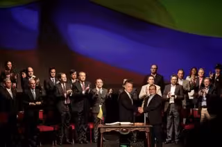 Archivo - El expresidente de Colombia Juan Manuel Santos y Rodrigo Londoño, junto al resto del alta mando de las extintas FARC en la firma de los acuerdos de paz de 2016. - JHON PAZ / ZUMA PRESS / CONTACTOPHOTO - Archivo