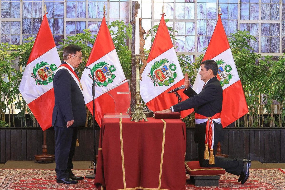 El hasta ahora ministro de Defensa de Perú, Luis Arroyo, presta juramento como nuevo primer ministro, en presencia del presidente del país, José Balcázar - PRESIDENCIA DE PERÚ EN X