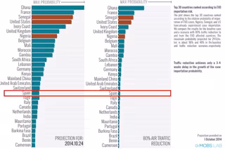Existe un 75 por ciento de probabilidades de que el ébola llegue a Francia antes de la última semana de octubre y un 50 por ciento de que para entonces se detecte el primer caso en Reino Unido, según un análisis basado en patrones de desplazamiento y ritmo de contagio, que sitúa a España en el puesto 19 entre los 30 países del mundo con mayor riesgo de contagio.