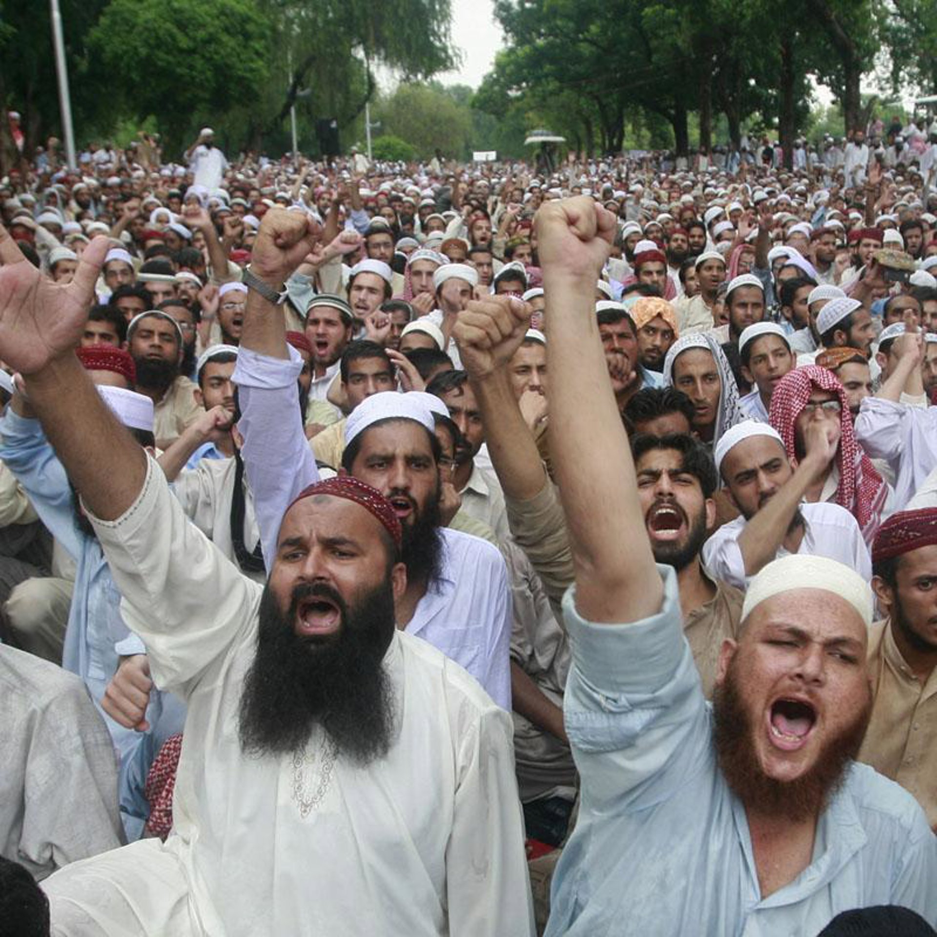 Cientos de islamistas paquistaníes se manifestaban esta mañana en este centro religioso de la capital paquistaní para conmemorar a las más de cien personas que murieron hace un año tras un asedio de una semana que enfrentó a islamistas y Ejército.