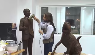 Los artistas Nikita Gusev y Vladimir Daragan han presentado una estatua de chocolate a tamaño real del presidente de Rusia, Vladimir Putin, la primera de su clase.