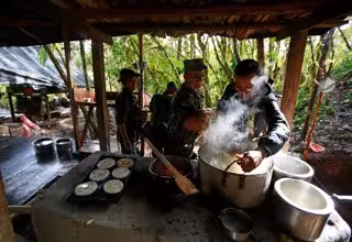 Guerrilleros con camisas cubriendo sus cabezas han dejado las armas y han cogido palas, machetes, martillos, motosierras y otras herramientas para construir salones de madera y ladrillo. "Se está trabajando las 24 horas en tres turnos para poder estar listos", ha contado 'Carlos Antonio Lozada'.
