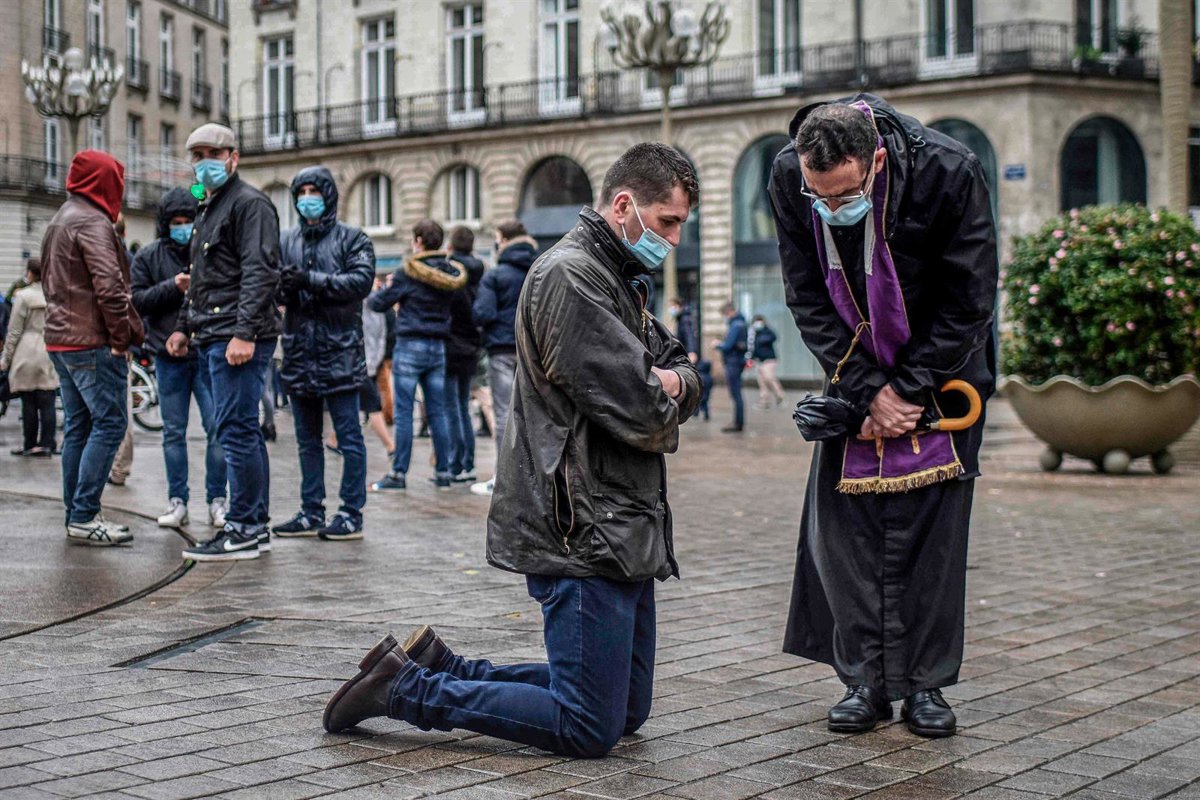 Un hombre se confiesa al aire libre en Nantes, Francia, durante la pandemia de COVID-19. - Sebastien Salom-Gomis/AFP/dpa - Archivo