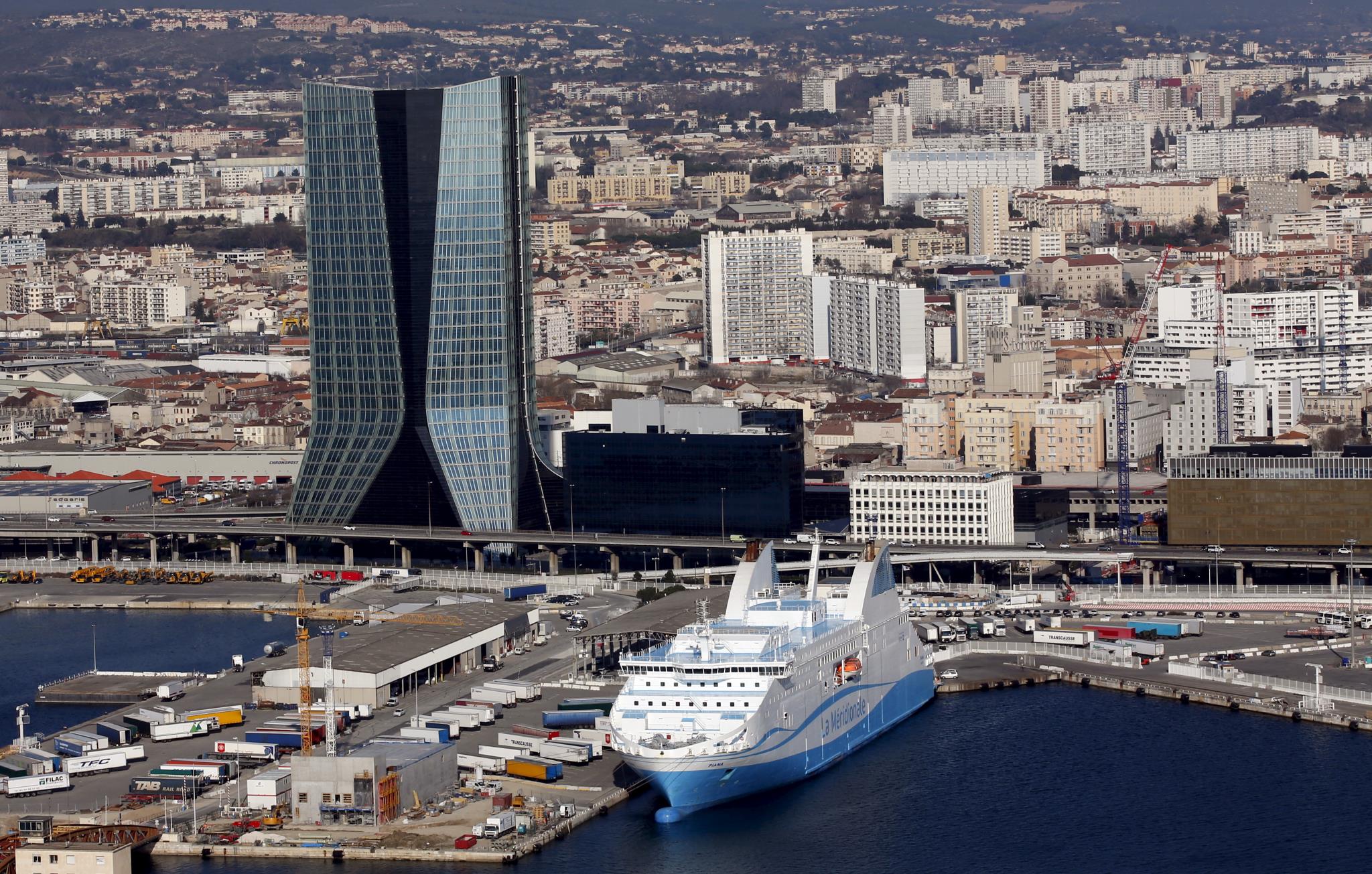 Vista aérea de la torre de la CMA-CGM en el Puerto de Marsella, Francia