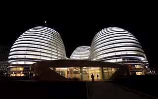 Vista del exterior del pabellón futurista para la exposición Mobile Art Chanel. Distrito central de Hong Kong.