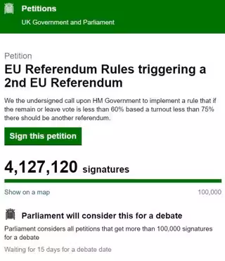 La petición ha sido alojada en la web del Parlamento británico, que se compromete a debatir la cuestión si se alcanzan 100.000 firmas. Hasta el momento ha reunido más de 4.127.000 firmas, pero algunas de ellas se han descartado ya por proceder del extranjero.