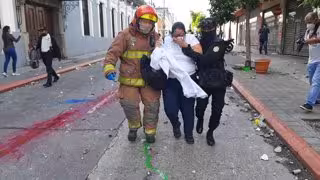 Una mujer afectada por el gas lacrimógeno y un policía durante las protestas contra el presidente Alejandro Giammattei en Guatemala - POLICÍA DE GUATEMALA