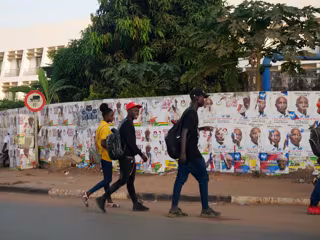 Personas caminando frente a un muro con carteles de la campaña presidencial en Bissau - REUTERS / CHRISTOPHE VAN DER PERRE