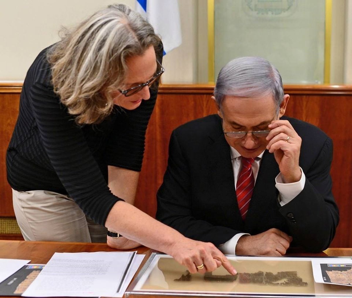 Pnina Shor, la responsable de la IAA para los pergaminos del mar Muerto, explicó a Netanyahu que el manuscrito pertenece al periodo de entre el año 30 a.C. y el 70 d.C.