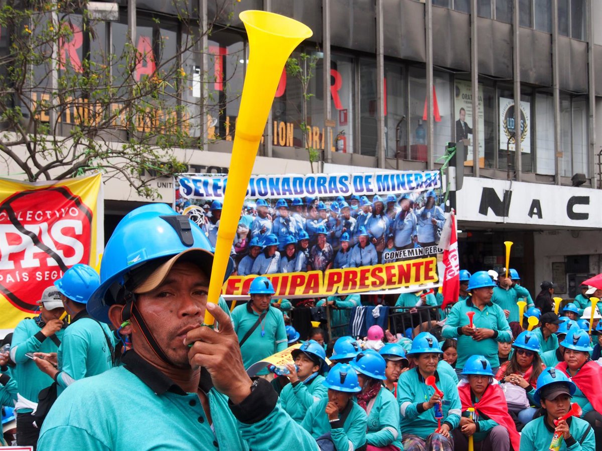 Archivo - Un minero toca una corneta durante la protesta de mineros artesanales frente al Congreso peruano en Lima el 28 de noviembre de 2024, en Lima, Perú, - Europa Press/Contacto/Carlos Garcia Granthon