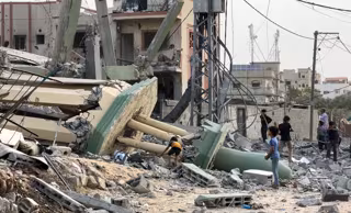 Palestinos ante los restos de la mezquita Al Hasanat, destruida por Israel en sus bombardeos contra el campamento de refugiados de Nuseirat, en la Franja de Gaza (archivo) - Belal Abu Amer/APA Images via ZU / DPA