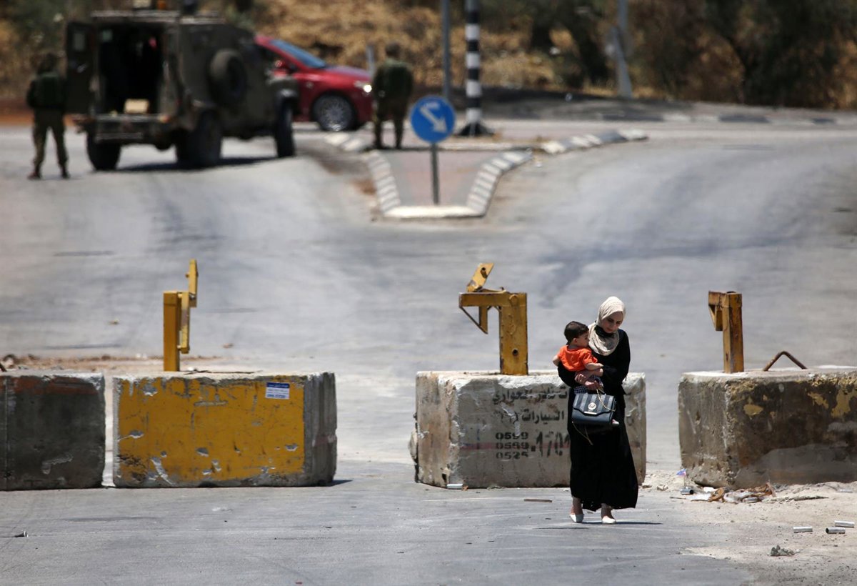 Archivo - Una mujer con un niño camina cerca de un vehículo de las fuerzas israelíes mientras las fuerzas de seguridad cierran la entrada de la localidad de Beita, al sur de la ciudad de Nablús, en el norte de Cisjordania. - Shadi Jarar'ah/APA Images via ZU / DPA - Archivo