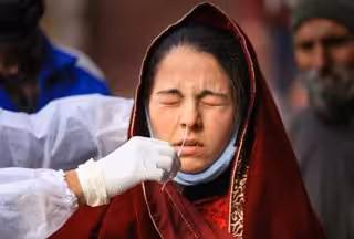 16 January 2022, India, Jammu: A health worker collects samples of a woman for COVID-19 test during COVID-induced restrictions. Photo: Ankur Sethi/PTI/dpa - Ankur Sethi/PTI/dpa