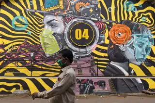 Un hombre con mascarilla pasa ante un mural en Bombay