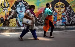 Dos mujeres pasean frente a un mural en India llevando mascarilla debido a la crisis sanitaria provocada por el coronavirus. - SUDIPTA DAS / ZUMA PRESS / CONTACTOPHOTO