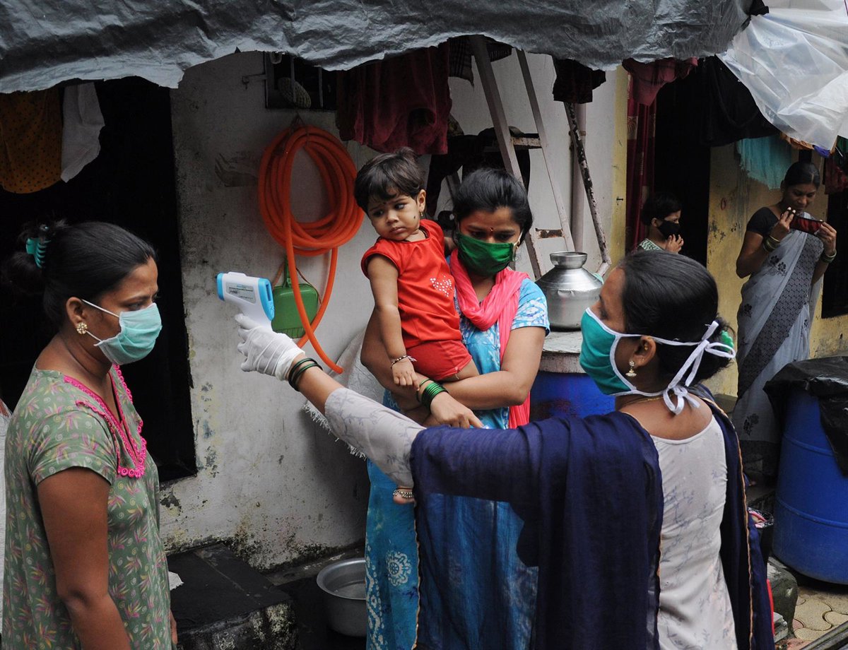 Una trabajadora del sistema de Salud toma la temperatura de un grupo de personas de un asentamiento irregular en el suburbio de Mankhurd, en el este de Bombay, India. - ASHISH VAISHNAV / ZUMA PRESS / CONTACTOPHOTO