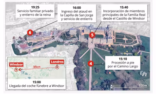 Pasadas las 15.00 horas, el convoy llegará al Castillo de Windsor y, poco antes de las 16.00, el féretro con los restos de Isabel II será aupado de nuevo para introducirlo en la capilla de San Jorge. El deán de Windsor oficiará un servicio religioso. El entierro tendrá lugar a las 19.30 y el Gobierno ha especificado que será una ceremonia privada.