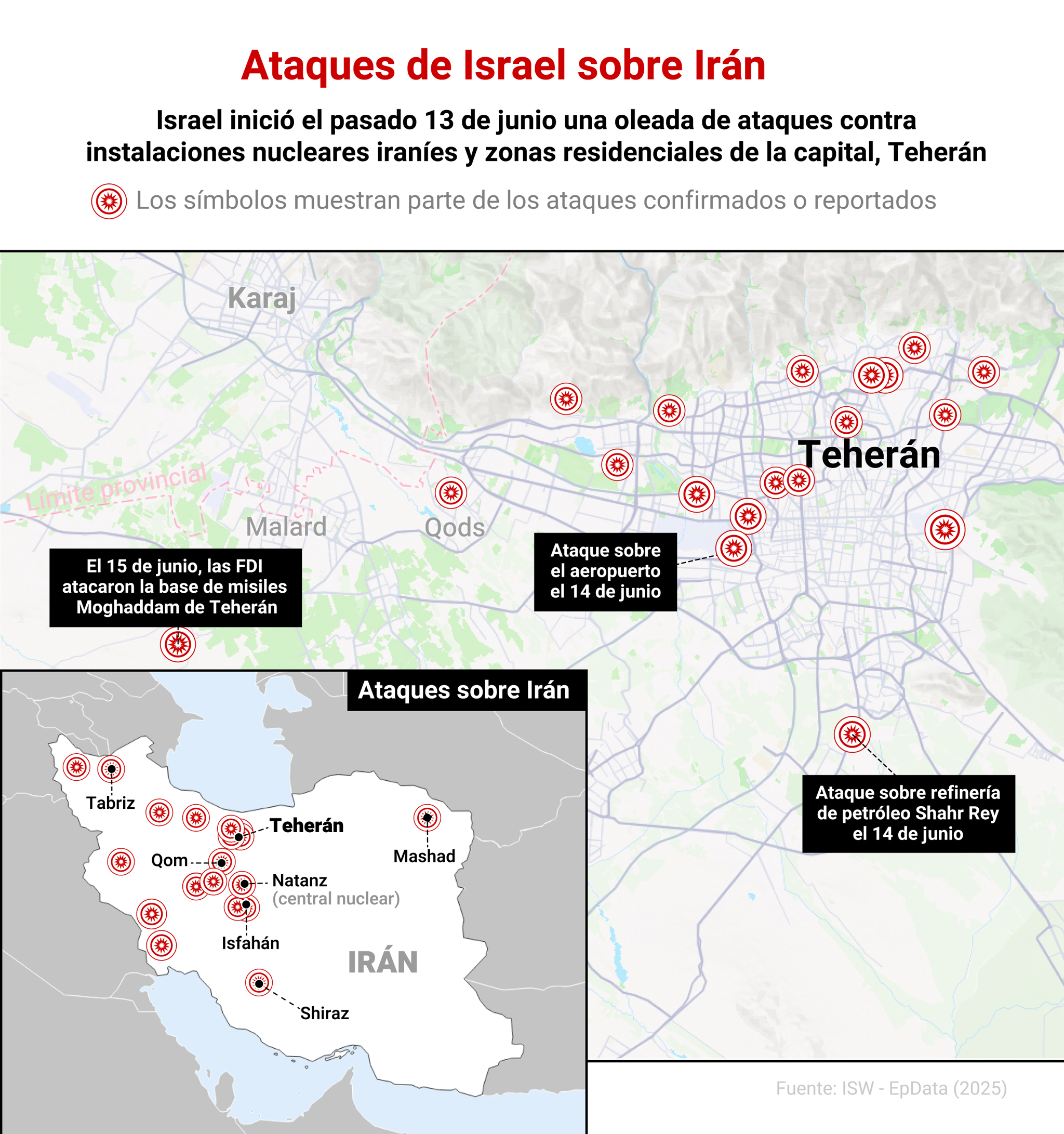 Horas antes, el portavoz en árabe de las FDI, Avichay Adraee, ha ordenado la evacuación de los residentes de la capital iraní, anunciando que el Ejército israelí atacaría "la infraestructura militar del régimen iraní". "Ciudadanos de Irán, por el bien de su seguridad, les pedimos que evacuen el área designada en el sector 18 del mapa. Su presencia en esta zona pone en riesgo sus vidas", ha declarado en su cuenta de X.
