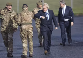 El prier ministro, Boris Johnson, anima a las tropas junto secretario para Irlanda del Norte, Brandon Lewis (D), y el brigada, Chris Davies (I), durante una visita a una base militar en Irlanda del Norte. - Peter Morrison/PA Wire/dpa