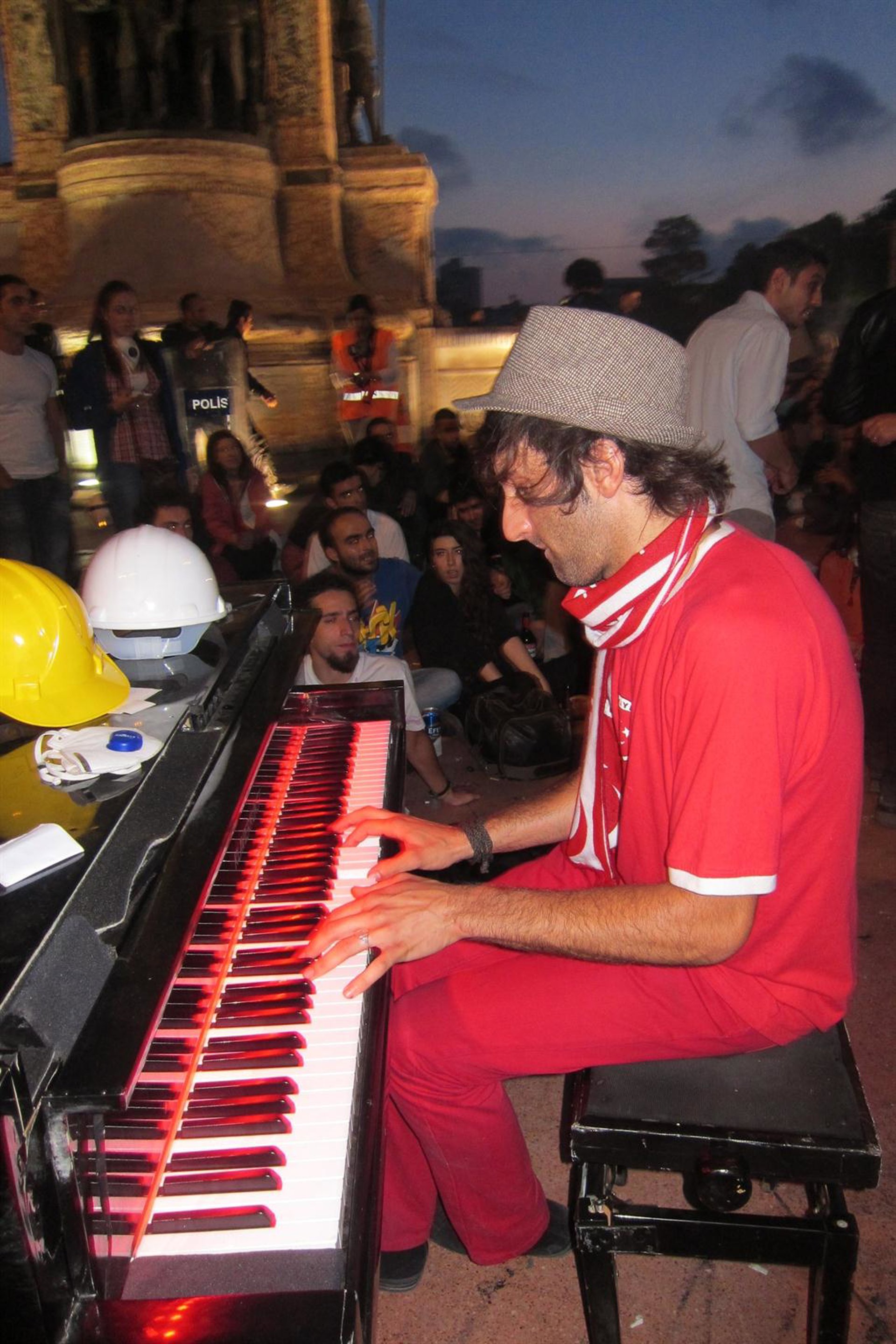 Un joven alemán, llamado Davide Martello, se ha convertido en uno de los símbolos de las protestas en Estambul al permanecer durante 17 horas tocando el piano en la céntrica Plaza de Taksim, con el fin, según ha explicado de "proteger" a los activistas que acampan en el contiguo parque Gezi de la Policía después de que en los últimos días haya utilizado gases lacrimógenos para poner fin a la ocupación del espacio público.
