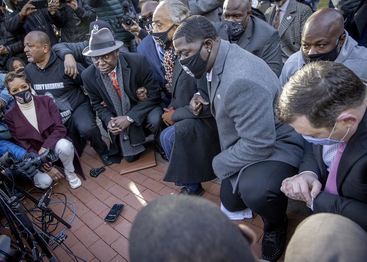 Miembros de la familia de George Floyd, la lucha por los derechos civiles y su equipo de defensa se arrodillan antes del comienzo del juicio sobre su muerte presuntamente a manos del agente de policía, Dereck Chauvin. - Elizabeth Flores/TNS via ZUMA Wi / DPA