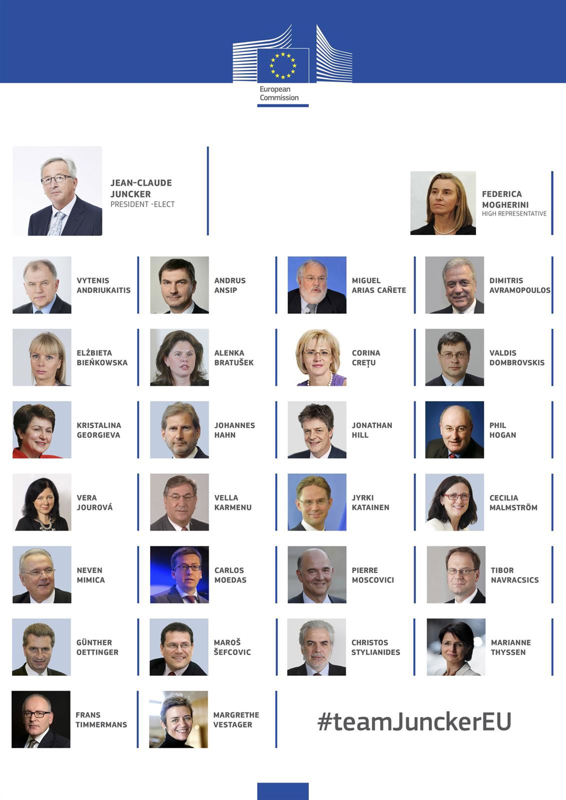 Repiten 6 miembros de la última Comisión de José Manuel Durao Barroso: la búlgara Kristalina Georgieva, hasta ahora responsable de Ayuda Humanitaria; el austríaco Johannes Hahn, que se ocupaba de Política Regional; la sueca Cecilia Malmström, comisaria de Interior; el croata Neven Mimica, que sólo se incorporó el año pasado con la entrada de su país y ocupa la cartera de Protección de los Consumidores; el alemán Günther Oettinger, de Energía; y el eslovaco Maros Sefcovic, responsable de Administración.