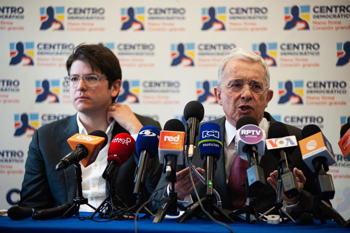 Archivo - A la izquierda, el senador atacado, Miguel Uribe Turbay, en rueda de prensa junto al expresidente de Colombia Álvaro Uribe Velez (2002-2006) - Europa Press/Contacto/Chepa Beltran - Archivo