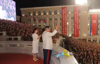HANDOUT - 25 April 2022, North Korea, Pyongyang: A picture provided by the North Korean state news agency (KCNA) on 26 April 2022, shows North Korean leader Kim Jong-un (R), alongside his wife, Ri Sol-ju, waving during a military parade at Kim Il-sung S - -/kcna/dpa