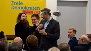 A continuación, Lindner se ha retirado con rapidez los restos de espuma de su rostro y se ha limpiado la mano en el pelo de la agresora, que ha sido reducida por varios miembros de seguridad del candidato. El líder de los liberales ha continuado con su discurso mientras se limpiaba los restos con una servilleta.