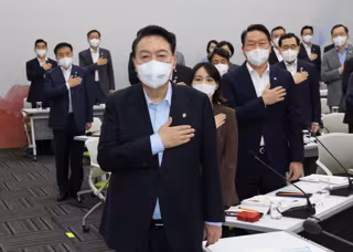 16 June 2022, South Korea, Seongnam: South Korean President Yoon Suk-yeol (C) salutes the national flag during a meeting on his government's economic policy directions, at Pangyo Techno Valley in Seongnam. Yoon said his government will pursue economic p - -/YNA/dpa