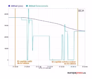 En el relato del vuelo siniestrado, el informe expone que el comandante salió de la cabina cuando comenzó la fase de crucero y que el copiloto cambió la selección de altitud del piloto automático de "38.000 pies a 100 pies" cuando "se encontraba solo en la cabina de mando". "La aeronave inició entonces un descenso continuo y controlado con piloto automático", afirman los investigadores galos.
