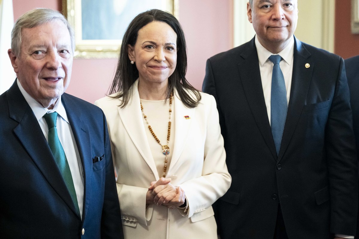 La opositora venezolana Corina Machado junto al senador estadounidense Dick Durbin (izquierda) y el senador Alex Padilla, durante su visita a EEUU. - Michael Brochstein / Zuma Press / ContactoPhoto