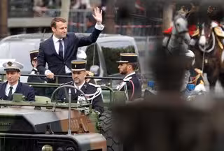 Una vez concluida la investidura en el Palacio del Elíseo, que ha durado alrededor de una hora, ha emprendido la subida por los Campos Elíseos en un camión militar de ACMAT, la filial de Renault para vehículos militares, aunque el acto se ha retrasado un poco debido a la lluvia que ha caído esta mañana sobre París.