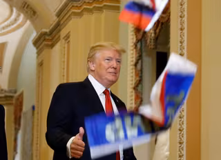 Un manifestante ha arrojado un puñado de banderas de Rusia al presidente de Estados Unidos, Donald Trump, al que ha acusado de "traición" cuando se dirigía a un almuerzo que iba mantener en el Capitolio con un grupo de congresistas republicanos.