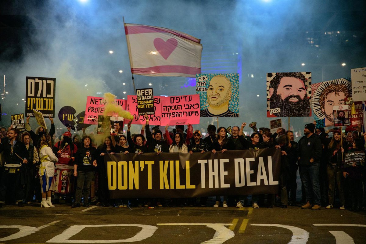 Los manifestantes exigen así que el Gobierno se ciña al acuerdo "hasta que el último rehén haya sido liberado", en referencia a la finalización prevista para este mismo sábado de la primera fase del acuerdo de alto el fuego.