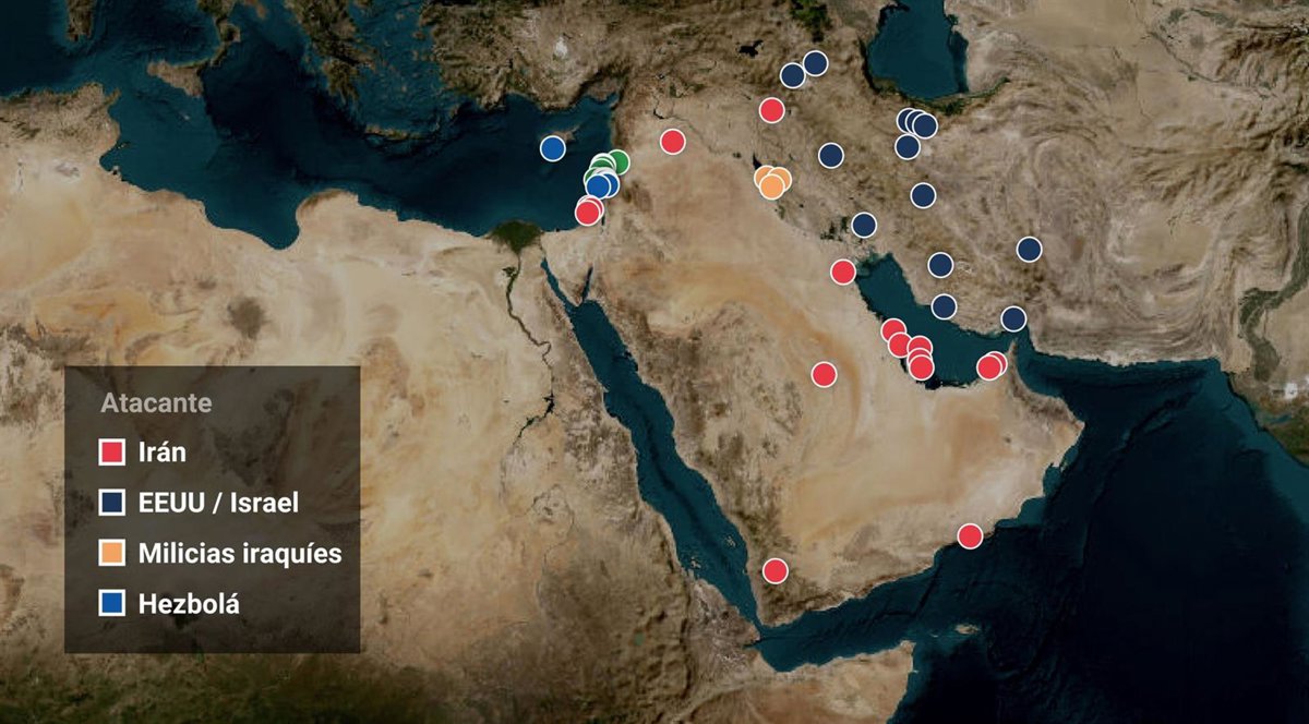 Los ataques iraníes han tenido como objetivo tanto territorio israelí como instalaciones y posiciones vinculadas a Estados Unidos en varios países de la región, entre ellos Bahréin, Qatar y Emiratos Árabes Unidos, además de la Embajada estadounidense en Riad, en Arabia Saudí. Chipre también ha denunciado daños limitados en una base británica tras el impacto de un dron de fabricación iraní.