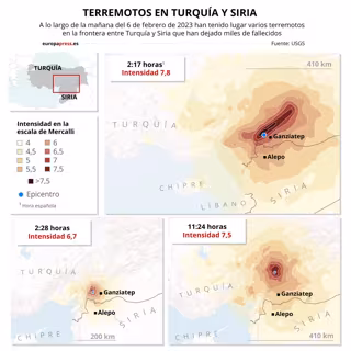 Una serie de catastróficos terremotos han sacudido a lo largo de este lunes la frontera entre Turquía y Siria, con un primer gran seísmo de magnitud 7,4 en la escala abierta de Richter al que le han seguido a lo largo del día más de 50 réplicas, algunas tan fuertes que han llegado a superar esa magnitud, y han dejado más de 2.300 fallecidos, según datos de autoridades de ambos países.