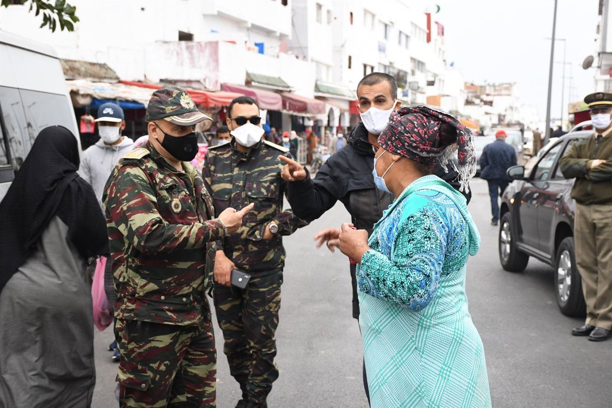 Miembros de las fuerzas de seguridad junto a otras personas con mascarilla en Rabat, Marruecos - CHADI / XINHUA NEWS / CONTACTOPHOTO