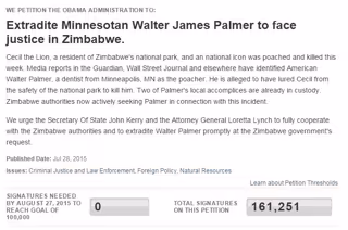 "Pedimos al secretario de Estado, John Kerry, y a la fiscal general, Loretta Lynch, que cooperen por completo con las autoridades de Zimbabue y que extraditen a Walter Palmer a petición del Gobierno de Zimbabue", dice la petición, que necesitaba 100.000 firmas para el 27 de agosto para obtener respuesta y que ahora está a punto de alcanzar las 162.000.