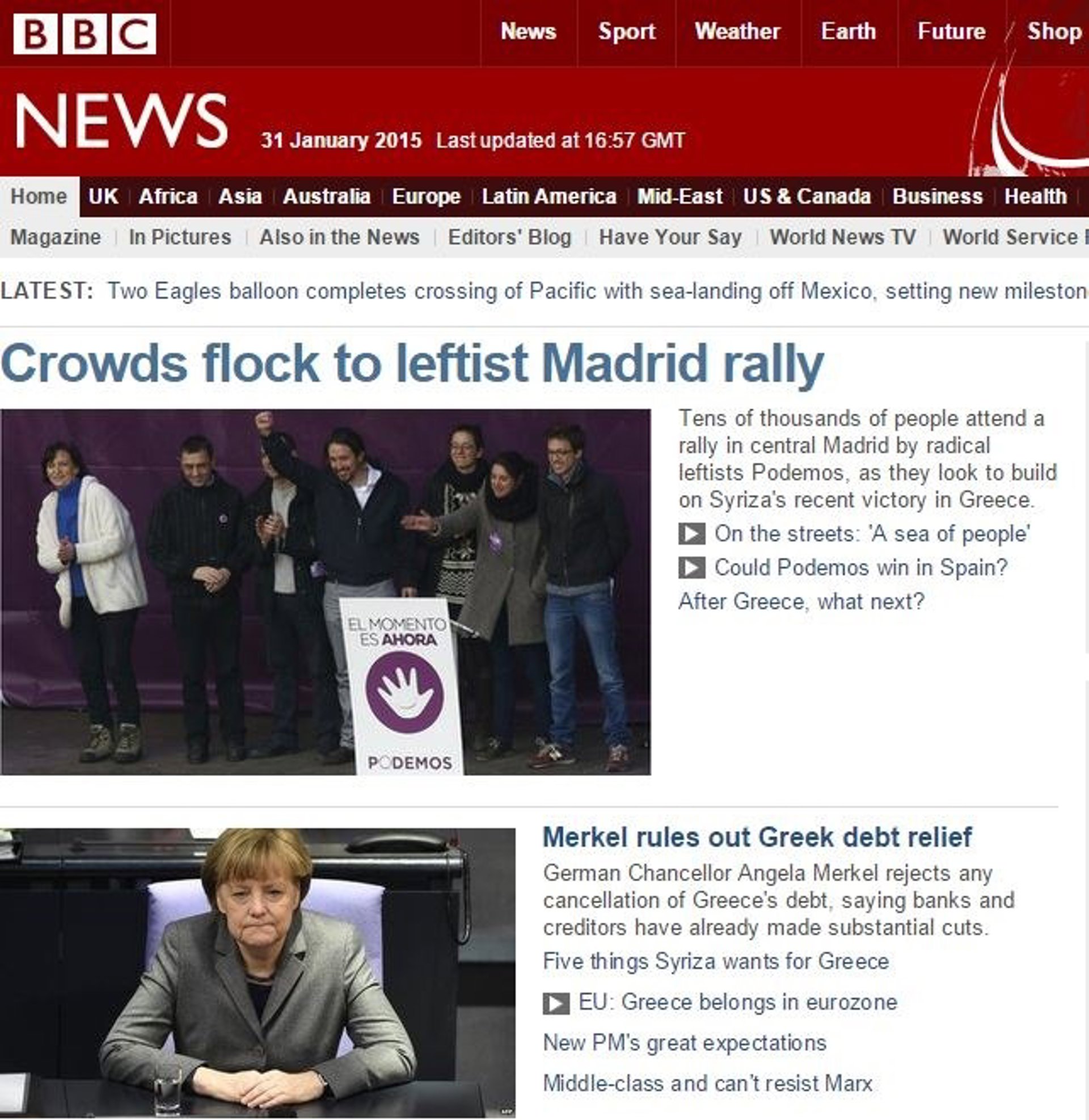 También en la web de la BBC abren con la convocatoria de Podemos, una "manifestación izquierdista", y publican una galería de fotografías del acto. Para la televisión pública británica "Podemos es aliado de SYRIZA y sos políticas son igual de radicales".