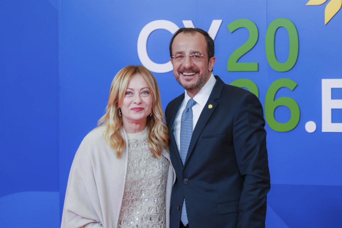 La primera ministra de Italia, Giorgia Meloni, recibida por el presidente de Chipre, Nikos Christodoulides, a su llegada a la cumbre informal de líderes de la UE en Nicosia. - ALEX MITA / EUROPEAN UNION